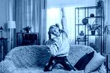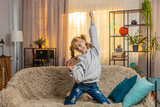 Young teenager girl takes moms phone at home, giggling while playing passing a tough online game level with excitement. Child kid on sofa shouting i did it and waving phone high in joy, celebrate win
