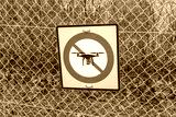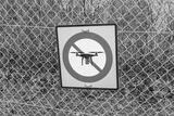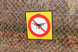 29 december 2025, Copenhagen, Denmark. Metal fence, prohibition sign in yellow with black border, black silhouette of a drone. Forbidden to fly a drone, no drone flights allowed. Military area in Cope