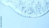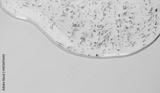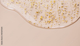 Serum fluid 24k gold gel facial cream smear, on beige pastel background. Beauty cosmetic product smudge, pure transparent lotion with gold particles, skin care jelly serum, top view Luxury moisturizer