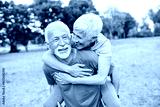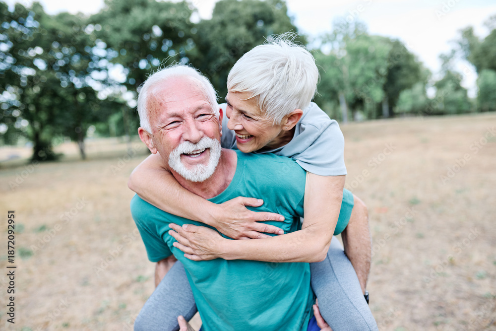 Smiling active senior couple having fun together in the park, active healthy elderly people bonding, older couple happy relationship