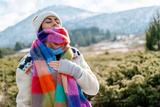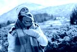 Beautiful Relaxed woman breathing fresh air in a snowy winter mountain