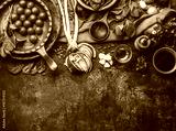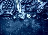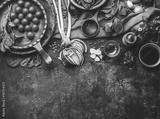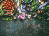Vegetarian cooking ingredients with fresh seasoning on rustic kitchen table with spoon , top view, place for text. Clean, vegan food and healthy eating.