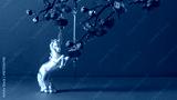 Chinese New Year of the Fire Horse. A golden horse figurine on a red background with Chinese lanterns and flowering branches. Festive atmosphere of the Lunar New Year.