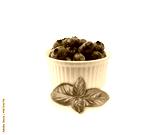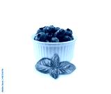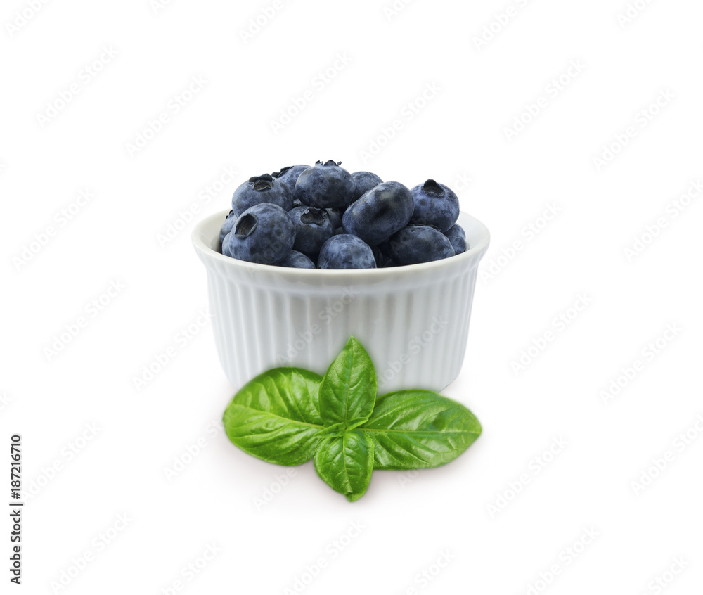 Blueberries with basil in a white bowl isolated on white background. Ripe blueberry with copy space for text.