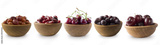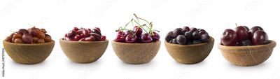 Dark red berries on a white background. Cherries, gooseberries, grapes and plums in a wooden bowl. Berry with copy space for text. Ripe and tasty berries isolated on white.