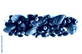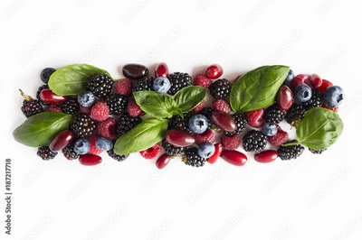 Black-blue and red berries isolated on white. Ripe blackberries, blueberries, raspberries, cornels and basil leaves on white background. Berries with copy space for text. Top view.