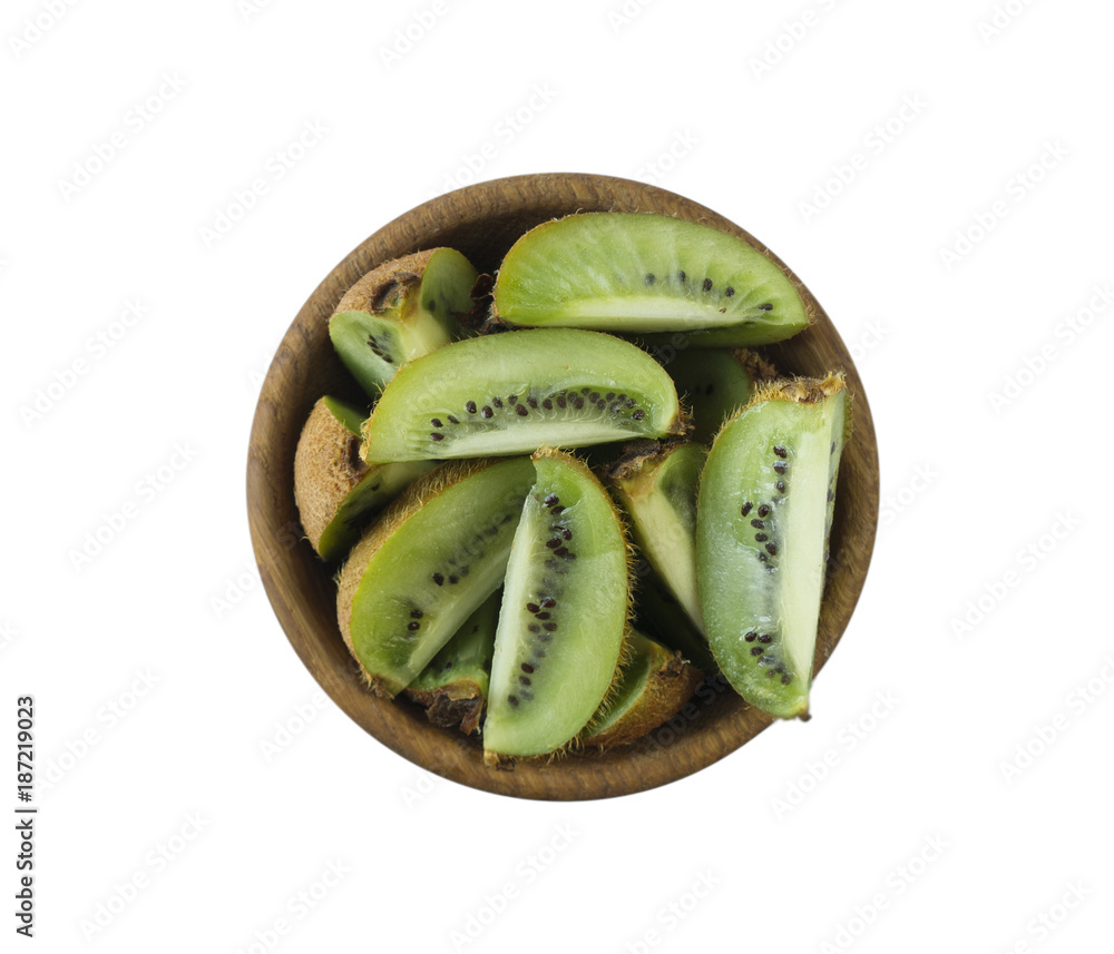 Kiwi slices in a wooden bowl with copy space for text. Ripe and tasty kiwi isolated on white. Kiwi fruit on a white background. Top view with copy space.