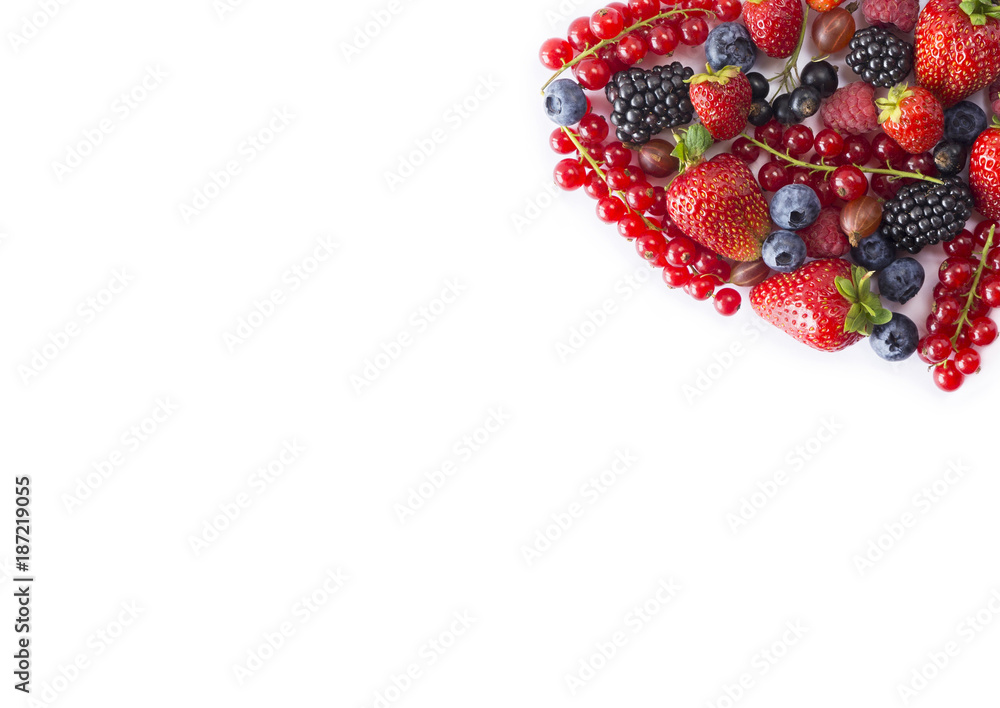 Black-blue and red food. Ripe blueberries, red currants, raspberries, strawberries, gooseberries on a white background. Mixed berries with copy space for text.