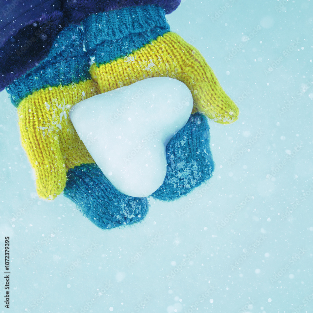 Hands in knitted mittens with heart of snow in winter day. Love concept. Valentine day background.