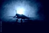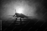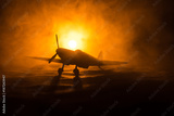 British jet-propelled model plane in possession. Dark orange fire background. War scene.
