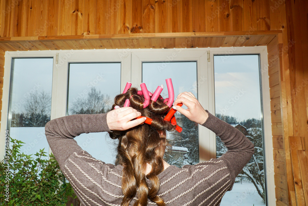 Orange and red hair curlers for hair on the head of a young woman. Creating a hairstyle at home.