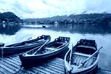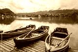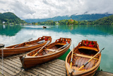 Three wooden boats along a wooden dock on the Alpine Lake Bled, with the iconic Bled Island in the distance, in the Julian Alps of Bled Slovenia.