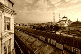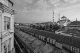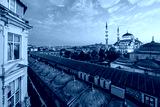 Early morning view from a balcony terrace overlooking the Spice Bazaar and New Yeni Mosque with the city skyline and Bosphorus Strait in view, in Istanbul, Turkey.