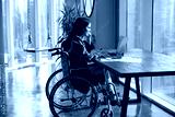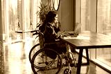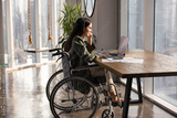 Focused young Latin businesswoman with disability working on Internet project in modern office, typing on laptop at paper marketing reports, sitting at workplace table in wheelchair
