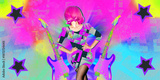 Retro-futuristic techno collage: Fashionable woman in a surreal acid-colored party world.