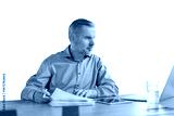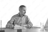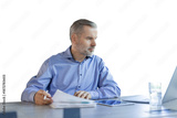 Mature businessman with beard working with documents, contracts and bills sitting at table using laptop at work on a transparent background