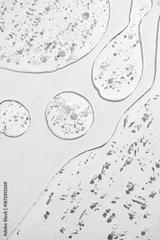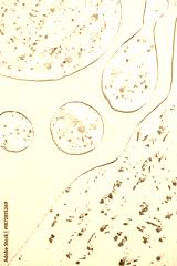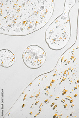 Serum fluid 24k gold gel facial cream smear, on light grey background. Beauty cosmetic product smudge, pure transparent lotion with gold particles, skin care jelly serum, top view Luxury moisturizer