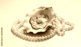Pearl, One natural pearl inside the oyster shell, close up, on light gray background. Nacre. Real Pearls necklace. Mother-of-pearl. Wealth concept.