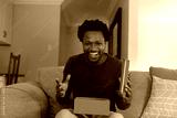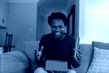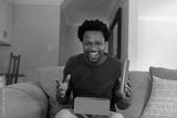 Portrait of cheerful excited african american man opening valentine's present box sitting at home