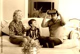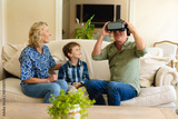 Caucasian grandmother and grandson watching grandfather wearing vr headset sitting on couch at home