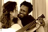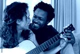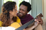 Happy romantic young multiracial couple playing guitar together at home