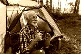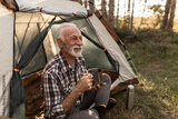 Senior man enjoying coffee while camping outdoors