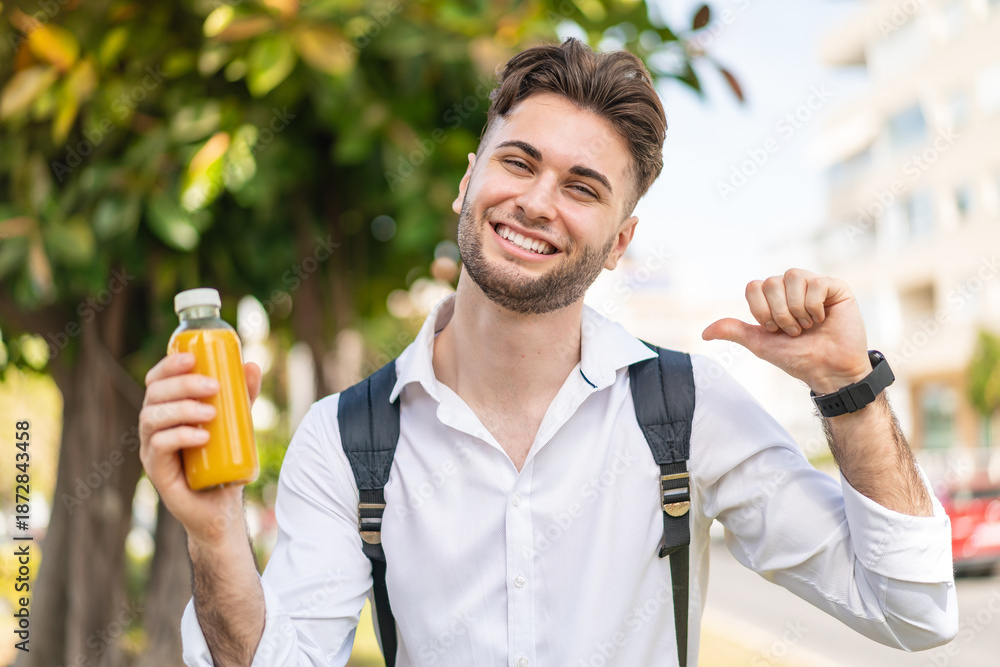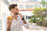 Young handsome man holding fried chips at outdoors thinking an idea and looking side