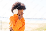 African American girl wearing winter muffs at outdoors smiling a lot