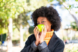African American girl at outdoors holding an apple