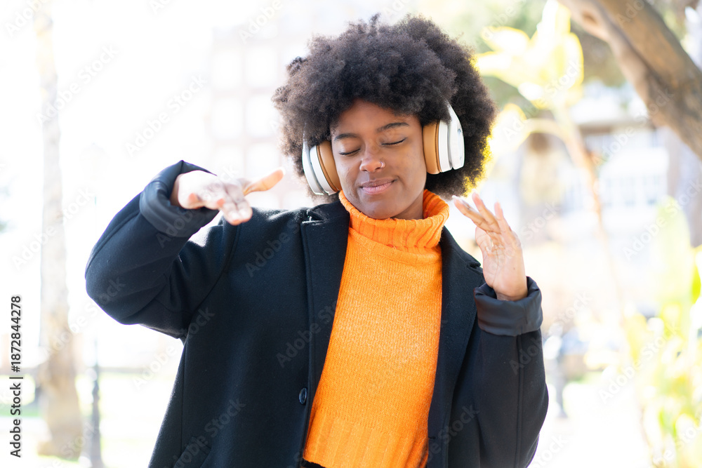 African American girl at outdoors listening music and dancing