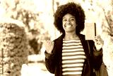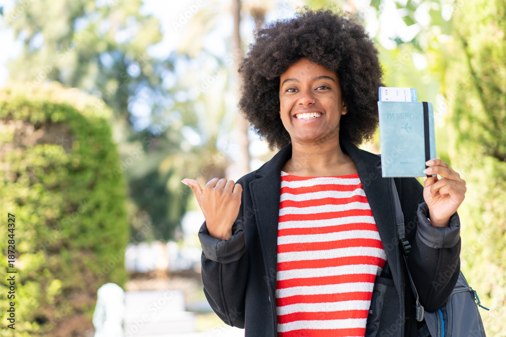 African American girl holding a passport at outdoors pointing to the side to present a product