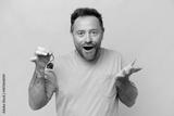 Middle age man holding home keys isolated on yellow background with shocked facial expression
