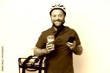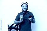 Middle age caucasian man with thermal backpack isolated on white background holding coffee to take away and a mobile
