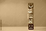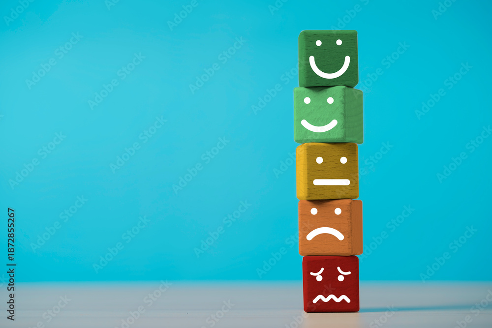 Customer evaluation concept with wooden blocks showing different facial expressions representing satisfaction feedback ,service quality of user experience rating and business performance.