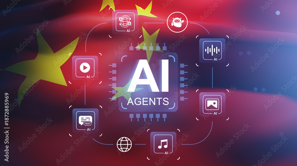 AI agents technology concept on digital China flag background showcasing creative artificial intelligence icons and futuristic interface design.