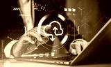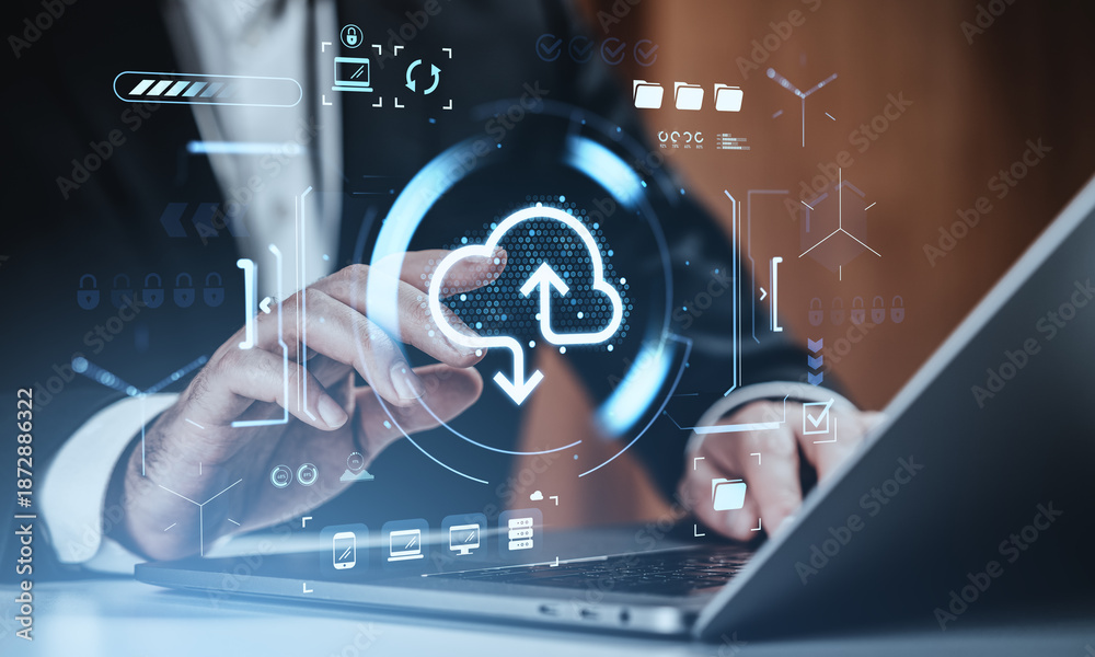 Businessman interacting with cloud upload download symbol on digital interface, representing global digital storage concept and service background.