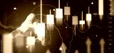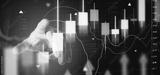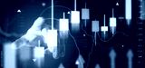 Business hand touching glowing forex candlestick chart with financial market rise indicators on futuristic blue background as investment concept hologram.