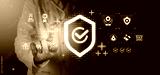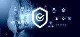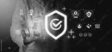 Doctor interacting with futuristic holographic interface displaying health insurance and medical service icons on dark digital background concept..
