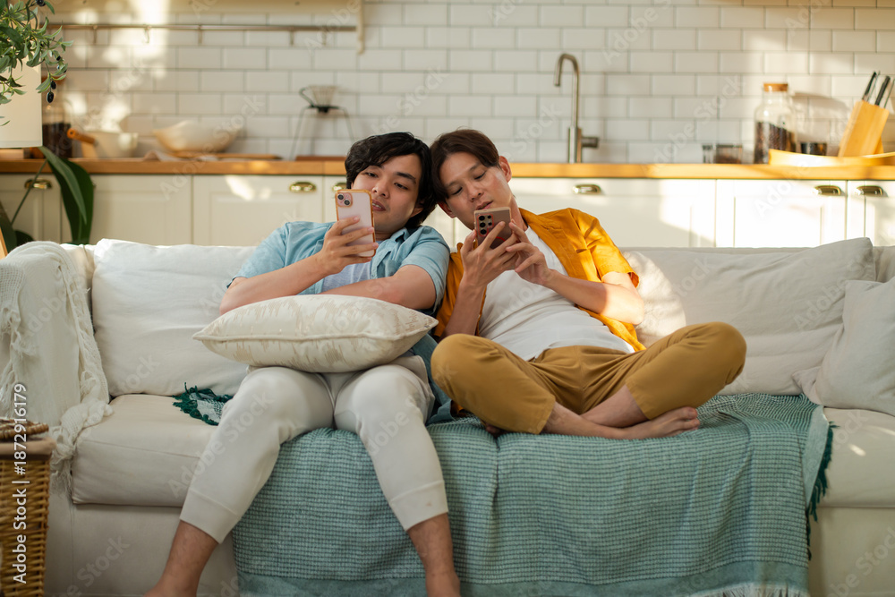 Asian male couple smiling and relaxing together on a cozy sofa, browsing social media or shopping online on a smartphone.Concept of LGBTQ+ relationship, domestic life and digital connection.