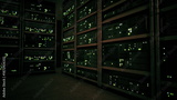 In a dimly lit data center, rows of servers emit a soft green glow. The atmosphere feels tech heavy, with lights flickering and the hum of machinery providing a sense of constant activity.