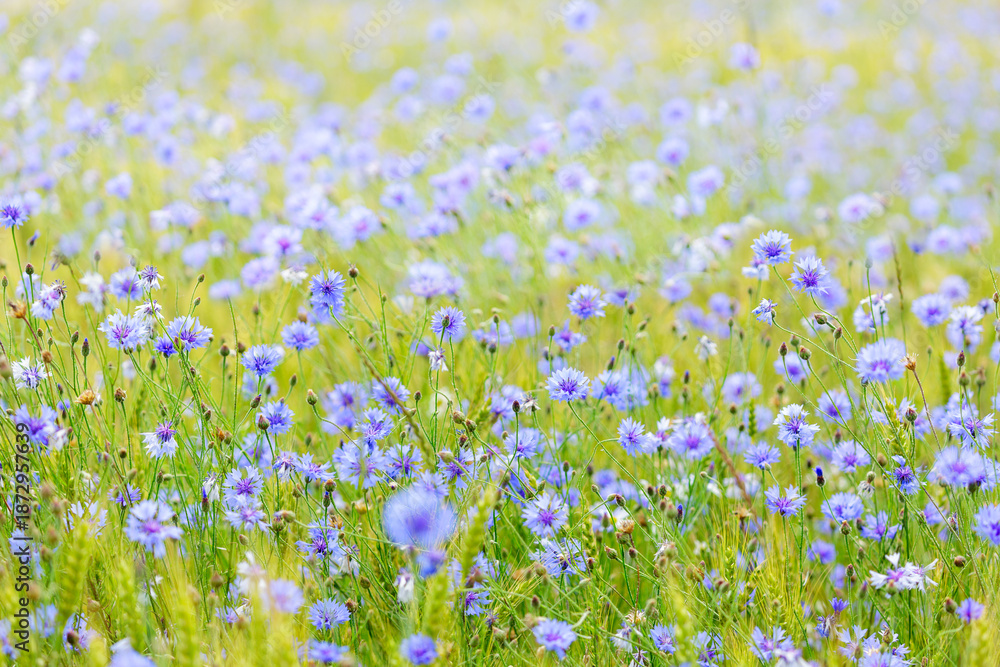 blooming blue cornflowers in a field on sunny day