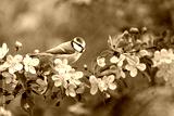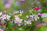 little bird perching on branch of blossom apple tree with pink flowers. Blue tit. Parus caeruleus