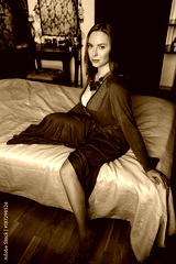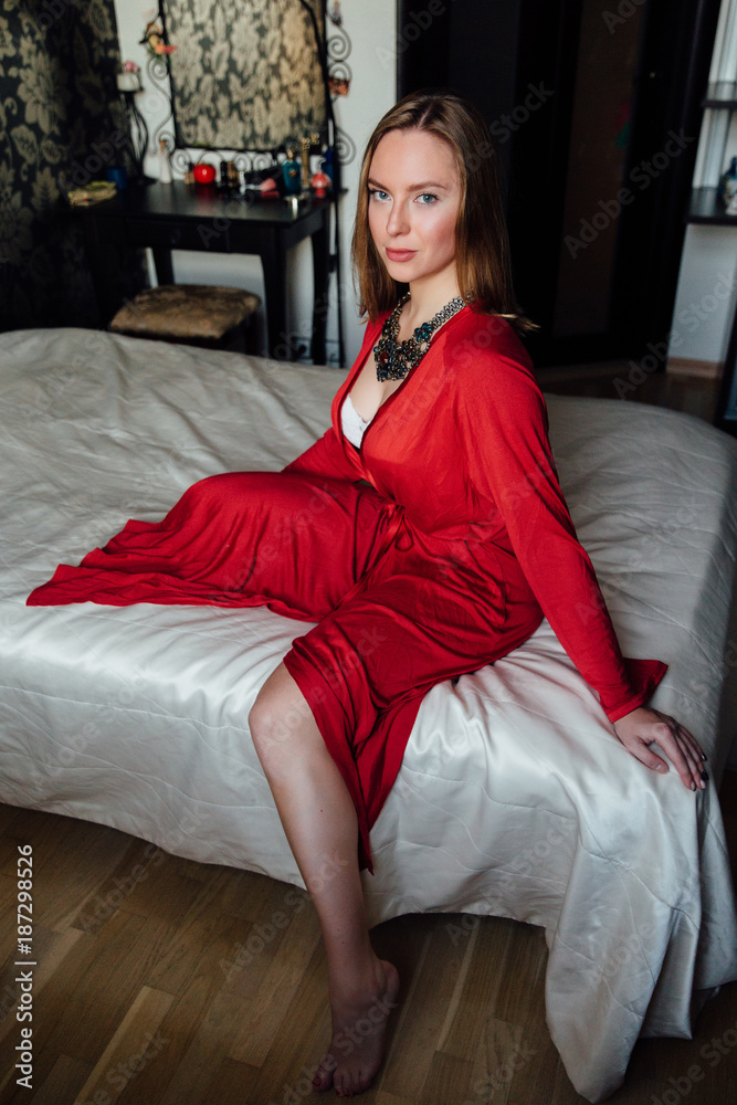 Beautiful sexy lady in elegant red robe. Fashion portrait of model indoors.