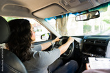 Woman learning driving skills from instructor during a car lesson, preparing for her road test