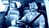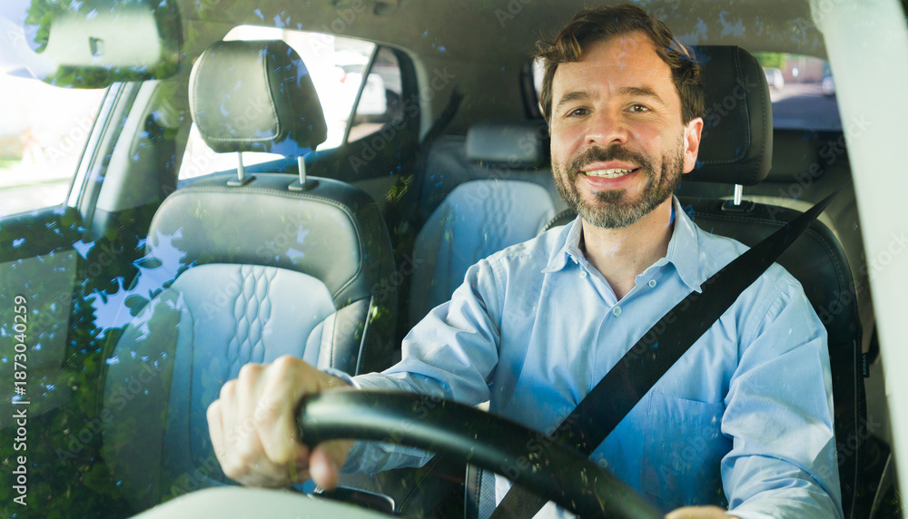 Smiling man driving car, wearing seatbelt, looking at camera. Commuting daily, safe journey, happy adult motorist