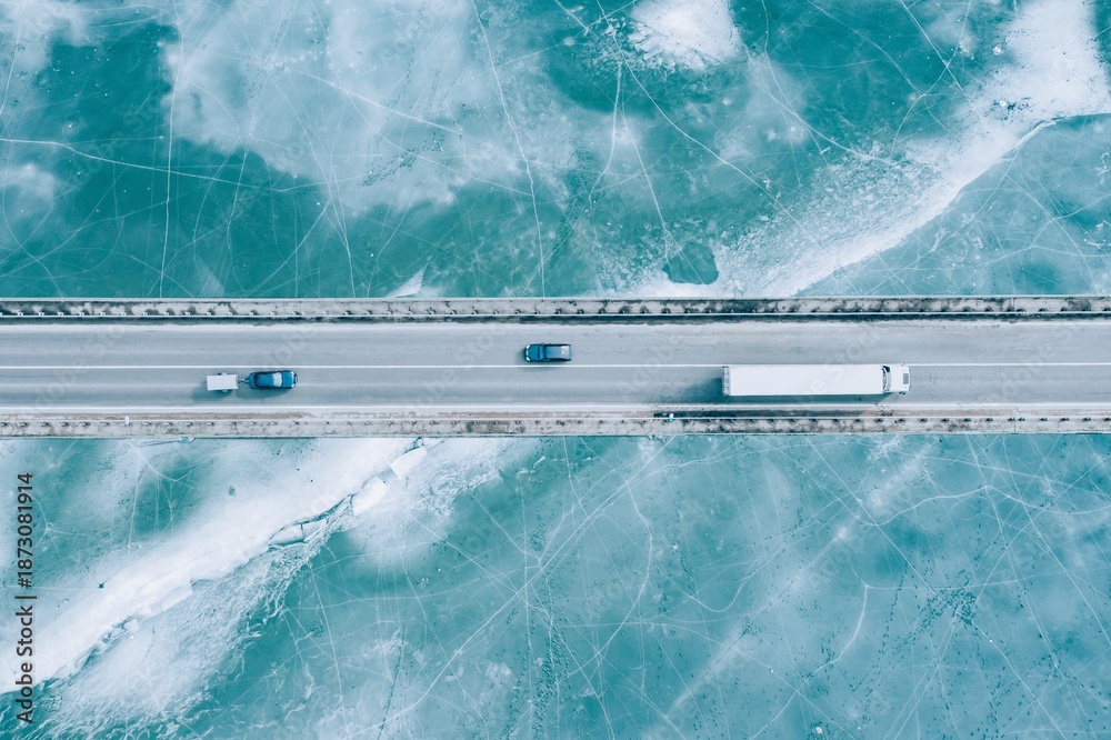 Aerial View of Vehicles on a Bridge over Frozen Water, Highlighting Winter's Hardships