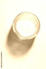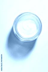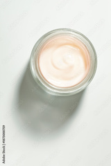Cosmetic peach orange cream gel in a jar top view light grey background mock up flat lay