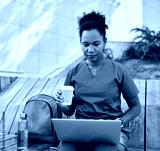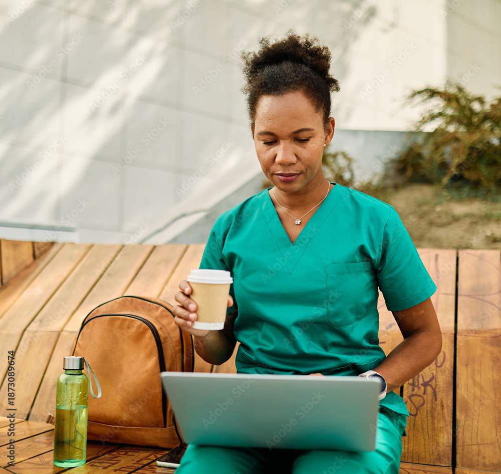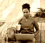 Young woman or a nurse or a doctor during office hours break enjoying sunny day while using laptop computer and relaxing on a bench