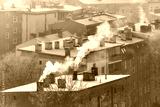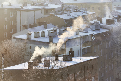 Smoking chimneys in Szczecin city at sunrise indicate burning of wood and coal in old home heating systems. Residents in many Polish cities complain of increasing health problems due to air pollution.