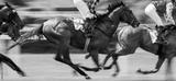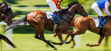 Horse racing. Panoramic view of running thoroughbred racehorse with unrecognizable jockey in motion. Blured panning shot